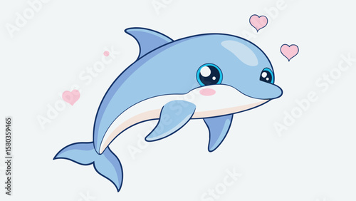 Fototapeta premium Cute blue dolphin with big eyes and pink hearts floating around
