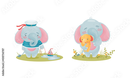 © Happypictures, Naklejka premium Cute Blue Elephant Character Holding Fluffy Toy and Wearing Sailor Hat Vector Set