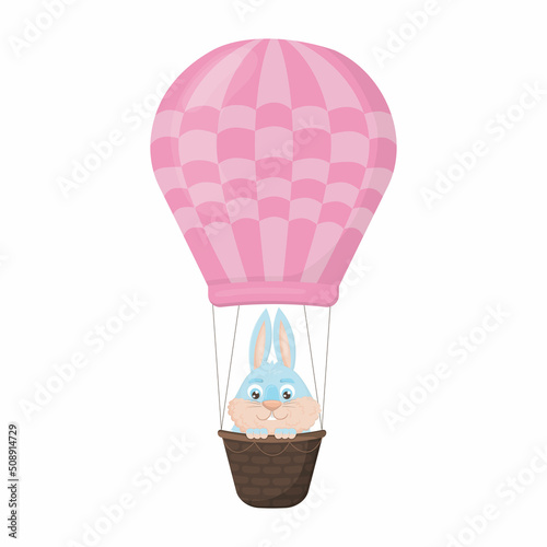 Fototapeta premium Cute blue hare enjoys a hot air balloon ride in a flat cartoon style