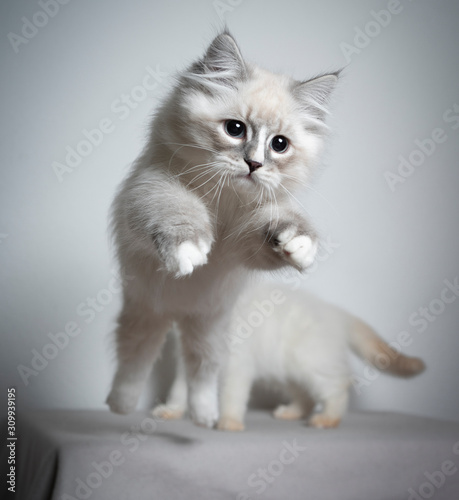 © furryfritz, Fototapeta premium cute blue silver tabby point white ragdoll kitten jumping indoors flying in the air looking focused playing