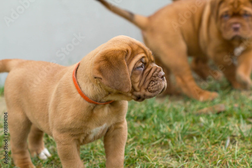 © littlehandstocks, Fototapeta premium Cute Bordeaux dog standing in the garden