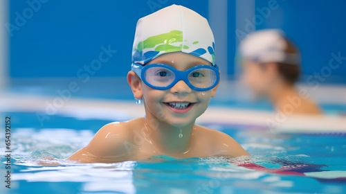 © ZAY WIN HTAI, Naklejka premium Cute boy in goggles relaxing and floating in swimming pool