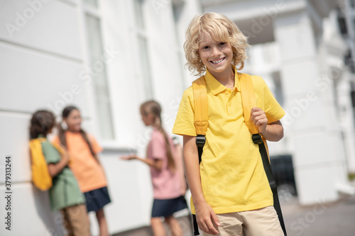 Obraz premium Cute boy in yellow tshirt smiling nicely and looking good