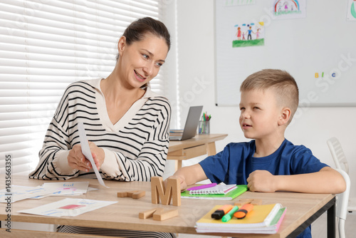 Fototapeta premium Cute boy learning letters with teacher at desk in school