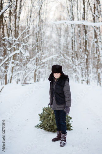 © k_zhuravleva, Naklejka premium Cute boy with a Christmas tree in his hands, winter, new year, forest