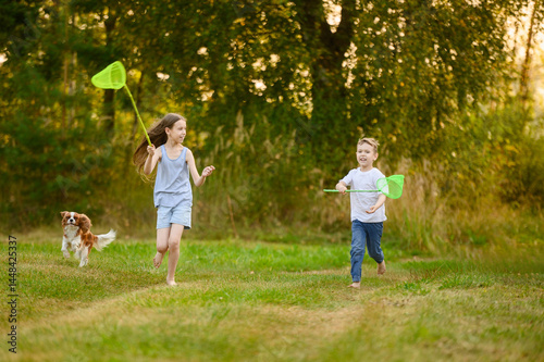 Obraz premium Cute brother and sister running barefoot with butterfly net on grass while playing outside with king charles spaniel dog. Countryside vacation, summer holidays, happy childhood, activity concept
