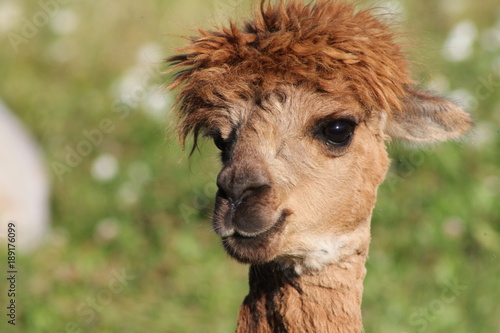 © Maximilian, Obraz premium Cute brown alpaca - close up photograph of a brown alpaca standing on a green meadow.