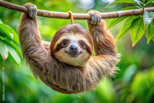 © Hugnaka, Naklejka premium Cute brown and white sloth hanging from tree branch