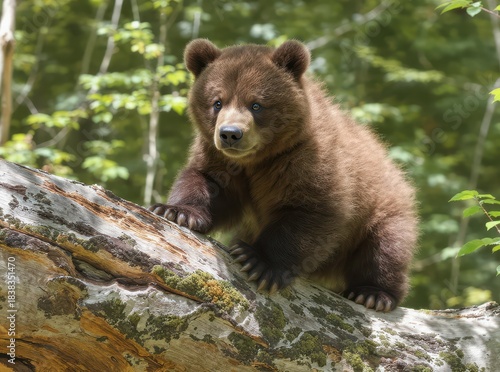 © Kitta Studio, Fototapeta premium Cute Brown Bear Cub Playing on a Log in a Forest Setting
