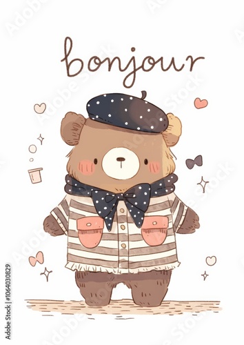 © Gro, Naklejka premium Cute Brown Bear Wearing Striped T-Shirt and Beret Hat with French Greeting Generative AI