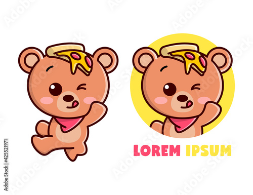 Fototapeta premium CUTE BROWN BEAR WITH A PIECE OF PIZZA ON HIS HEAD WHILE JUMPING CARTOON MASCOT.