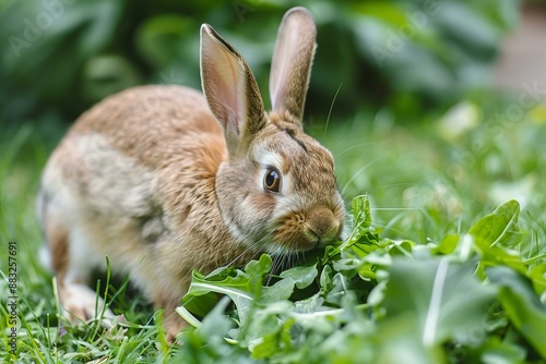 © Simon, Fototapeta premium Cute Brown Bunny Eating Fresh Green Leaves