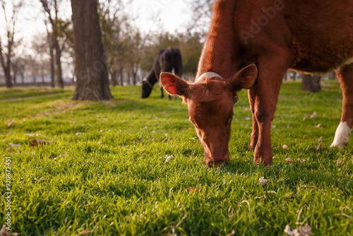 © elenaseiryk, Obraz premium Cute brown calf grazing in sun light. Young cow eating grass. The other black calf grazing on background. Cattle farm