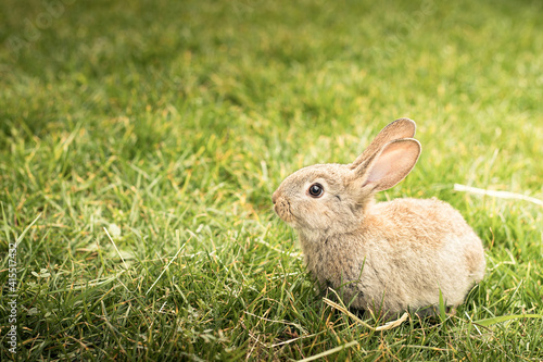 Fototapeta premium Cute brown Easter bunny in the green grass. Spring background, wallpaper with...