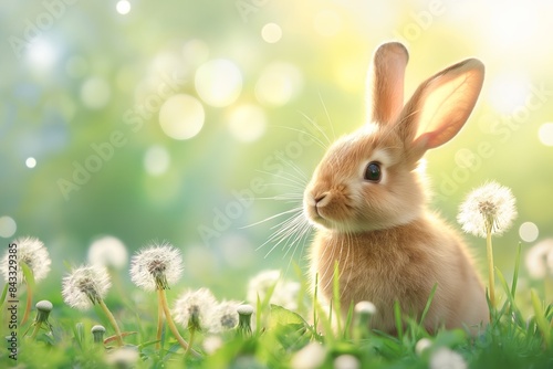 Obraz premium Cute brown rabbit in a green field of dandelions, looking at the camera on a sunny spring day. Easter themed background with open space. Easter bunny concept.