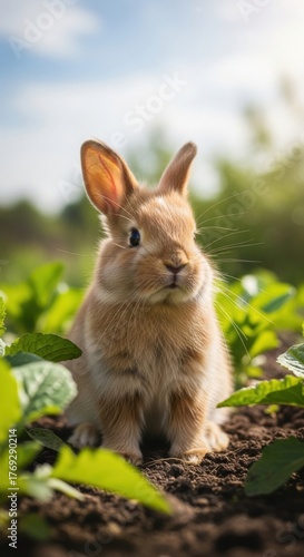 Fototapeta premium Cute brown rabbit sitting among fresh green plants in a sunny garden during daytime