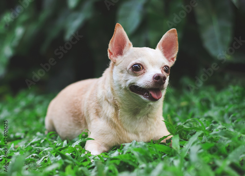 © Phuttharak, Fototapeta premium cute brown short hair chihuahua dog lying down on green grass in the garden, looking curiously.