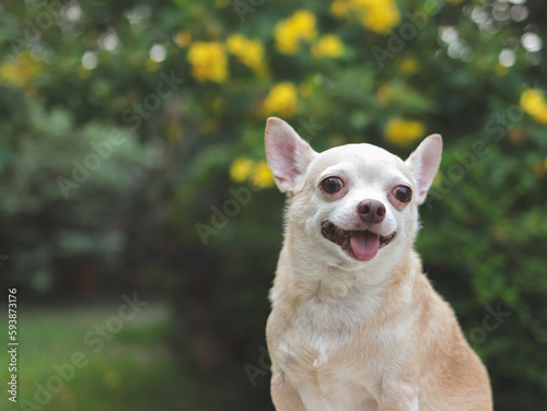 © Phuttharak, Fototapeta premium cute brown short hair chihuahua dog sitting in the garden, looking curiously. Copy space.