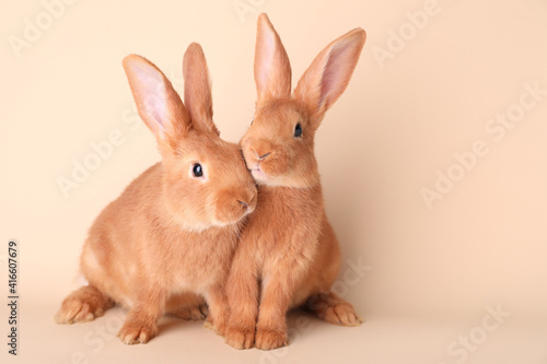 © New Africa, Fototapeta premium Cute bunnies on beige background, space for text. Easter symbol
