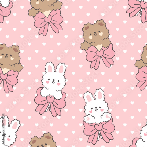 © CandyLama, Fototapeta premium Cute bunny and bear with a bow on a pink background with hearts texture, kawaii animals valentines