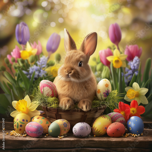 Fototapeta premium Cute Bunny and Easter Basket Amidst Bright Easter Spring Blooms with...
