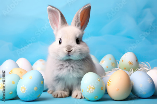 Obraz premium Cute Bunny, Around Painted Easter Eggs On Light Blue Background, Cartoony. Generative AI