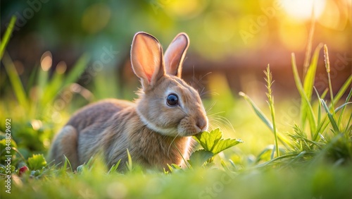 Fototapeta premium Cute Bunny Blur: A soft, blurred image of a bunny nibbling on grass in a garden.