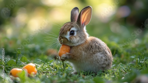 Fototapeta premium Cute bunny eating carrot in grassy field, sunny day, nature background;...