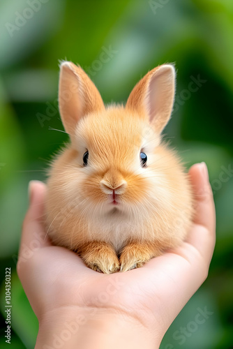© Lailatul, Fototapeta premium Cute bunny held in hands, green background