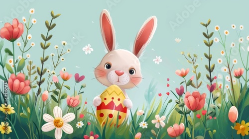 Fototapeta premium Cute bunny holding an Easter egg, surrounded by flowers, vector illustration...