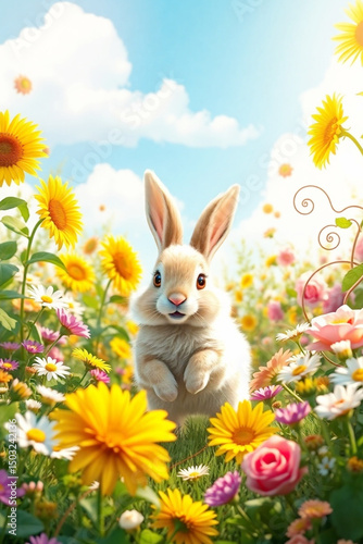 Fototapeta premium Cute Bunny in Sunny Flower Field