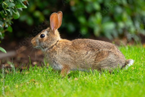 © Saeedatun, Fototapeta premium Cute bunny is sitting on the lawn in the backyard in summer day.