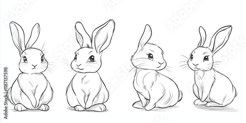 © Kavidu, Obraz premium Cute Bunny Rabbit Outline Sketch Vector Illustration with Minimal Line Art Doodle in Different Poses
