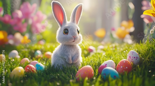Fototapeta premium Cute bunny rabbit surrounded by colorful Easter eggs in a spring meadow.