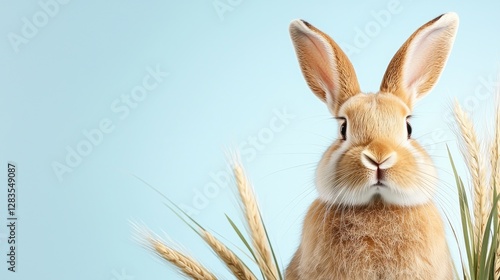Obraz premium Cute bunny, wheat stalks, blue background, Easter