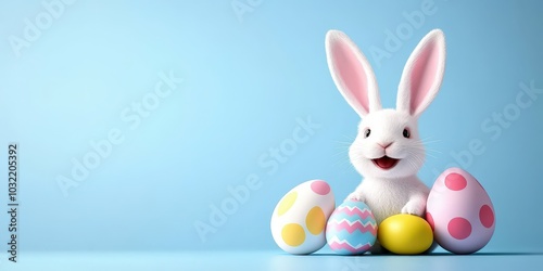 Obraz premium Cute Bunny with Colorful Easter Eggs on a Blue Background