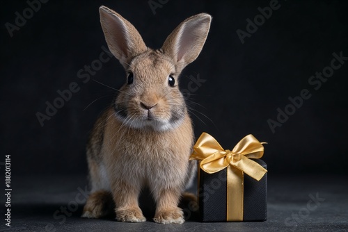 Obraz premium Cute bunny with gift box and golden ribbon on dark background