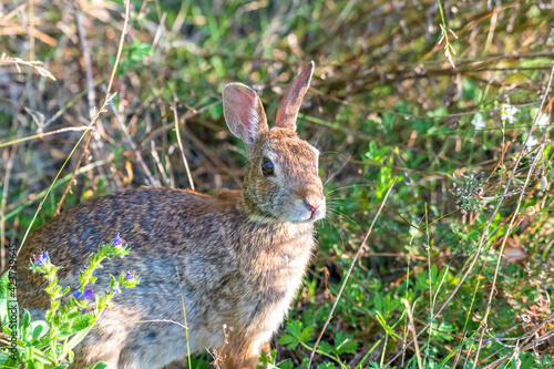 © Karen Hogan, Fototapeta premium Cute bunny with its ears straight up sitting at the side of a path in the woods. Eastern cottontail rabbit.