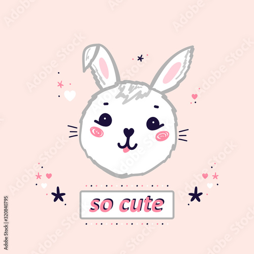 © AllNikArt, Fototapeta premium Cute Bunny with Stars, Hearts and "So Cute" Phrase. Easter Happy Rabbit Face. Little Hare Vector Illustration. Scandinavian Print or Poster for Nursery, Baby Shower Card, T-shirt Print Design for Kids