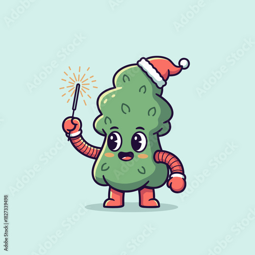© MandawRasta, Obraz premium Cute Cannabis Bud Character Celebrating Christmas with Sparkler.
