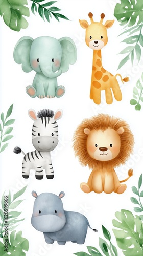 © Olga, Naklejka premium Cute cartoon african animals with leaves - elephant, giraffe, zebra, lion, hippo