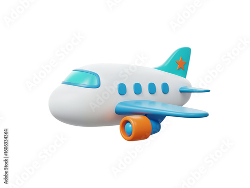 © Creative Design, Fototapeta premium Cute cartoon airplane with blue wings and orange engine isolated on transparent background for travel and aviation themes