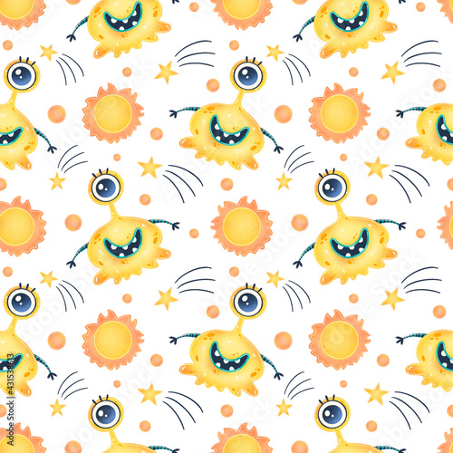 Obraz premium Cute cartoon aliens seamless pattern. UFO pattern. Cute monsters seamless...