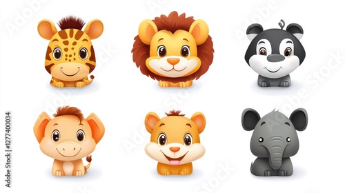 © 11faqihtanjung, Naklejka premium Cute cartoon animal faces, baby giraffe, lion, panda, monkey, elephant, and various other adorable wild animal characters set on a white background.