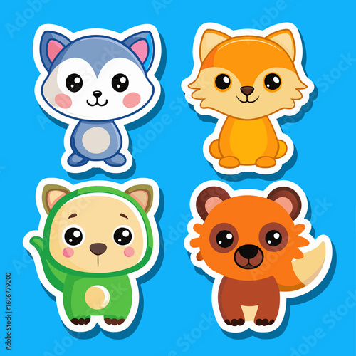 Fototapeta premium Cute cartoon animal stickers on a blue background.