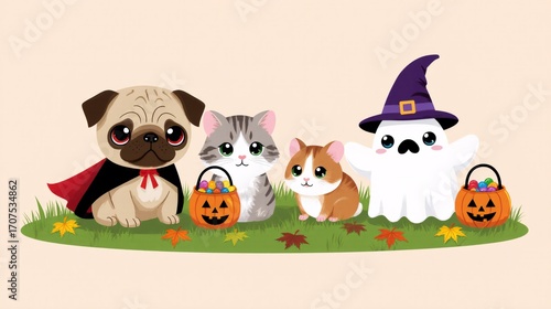 © obscuronata, Naklejka premium Cute cartoon animals and ghost celebrating Halloween with candy baskets.