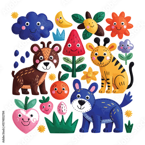 © MdMaynul, Naklejka premium Cute cartoon animals and nature elements with happy faces