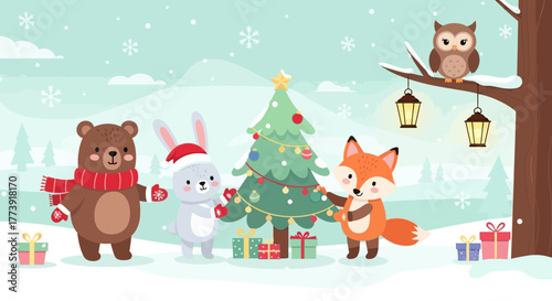 Naklejka premium Cute cartoon animals decorating a Christmas tree in a snowy winter landscape...