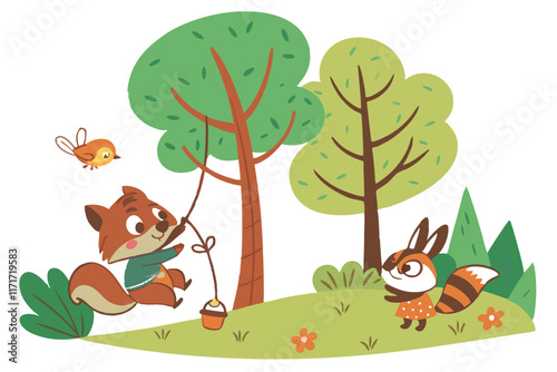 © Manik Mia, Fototapeta premium Cute cartoon animals, forest background, flat vector, children's illustration white background