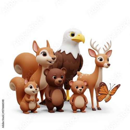 Naklejka premium Cute Cartoon Animals Group with Squirrel, Bear, Eagle, and Deer